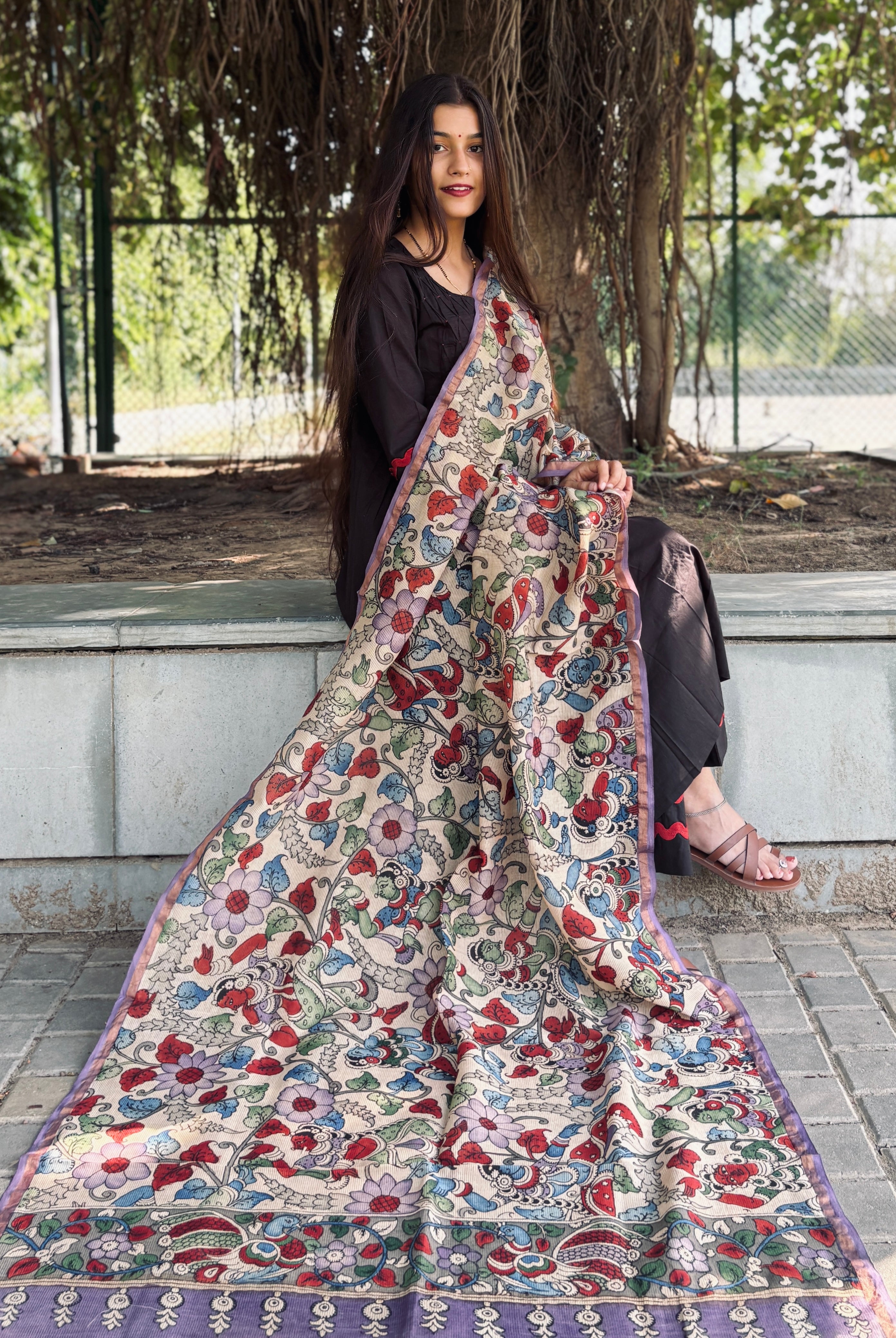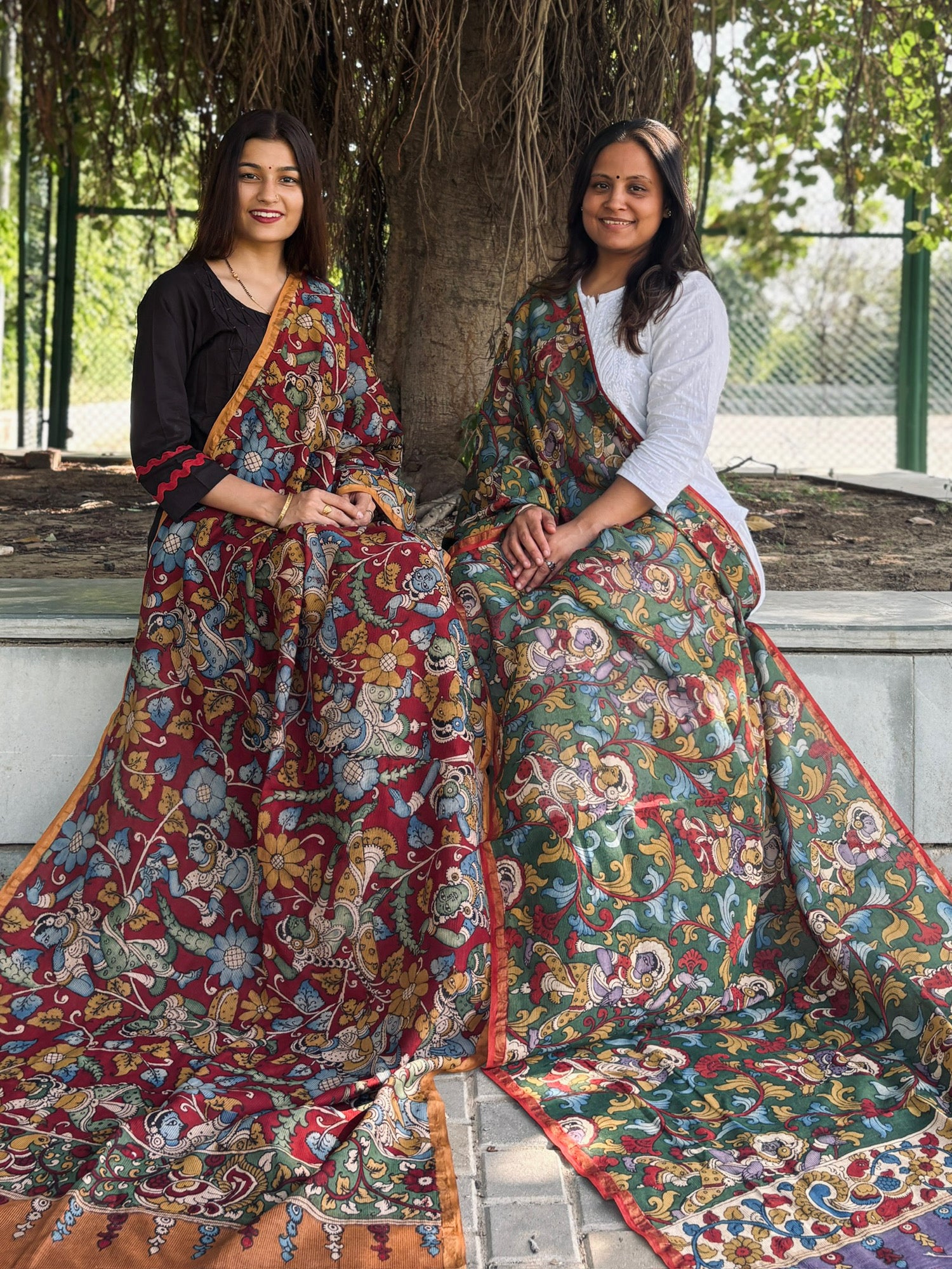 Crafted in the timeless art of Kalamkari, this dupatta is hand-painted using natural vegetable dyes. Featuring intricate god figurines and temple motifs, it carries the essence of heritage artistry, making it a perfect pick for the festive season.