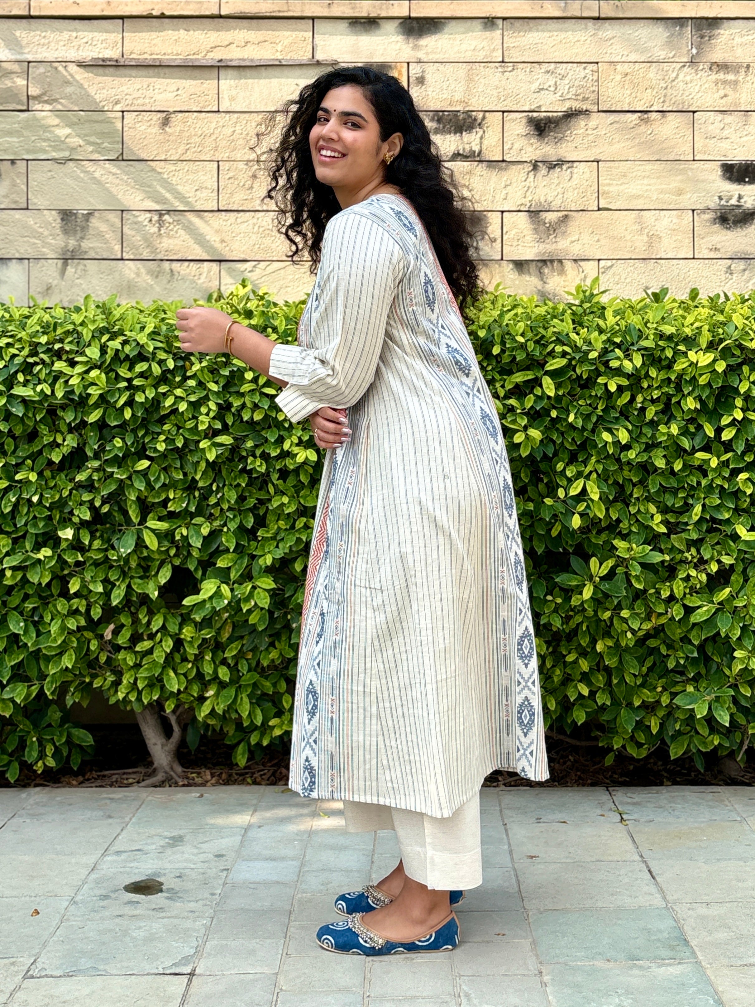 The kurta features an easy monotone silhouette with a bohemian weave design- ideal for casual day out, travel or work!